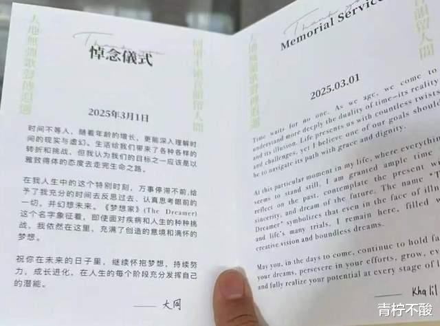 在悼念仪式的卡片上,也写着“祝你在未来的日子里,继续怀抱梦想,持续努力,成长进化,在人生的每个阶段充分发挥自己的潜能。”